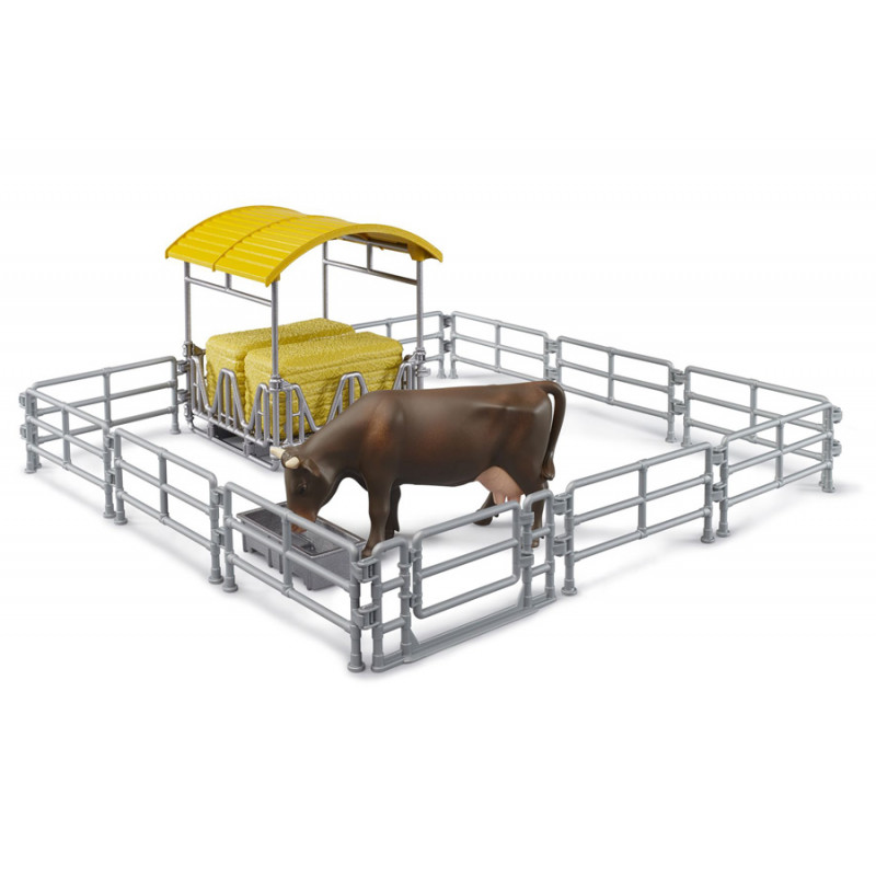 Coffret de jouets Bruder à l'échelle 1/16 comprenant un râtelier à foin avec des barrières, une vache et une auge. Ces accessoires complètent les jouets agricoles Bruder.