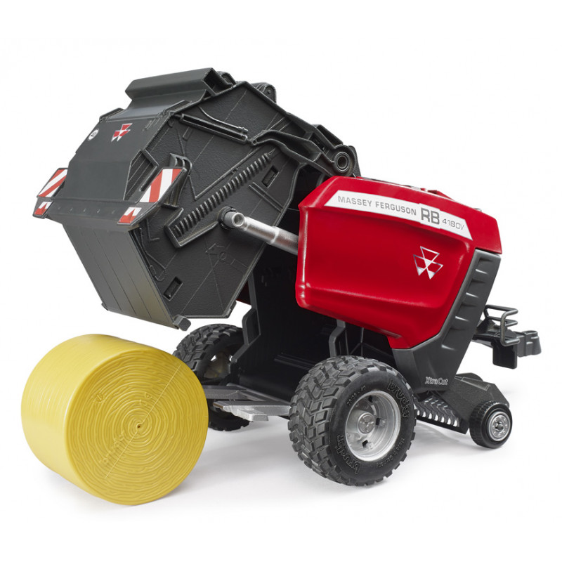Presse à balles rondes Massey Ferguson RB 4180V à l'échelle 1/16 du fabricant Bruder, livrée avec une balle de paille, compatible avec les tracteurs et jouets agricoles Bruder.
