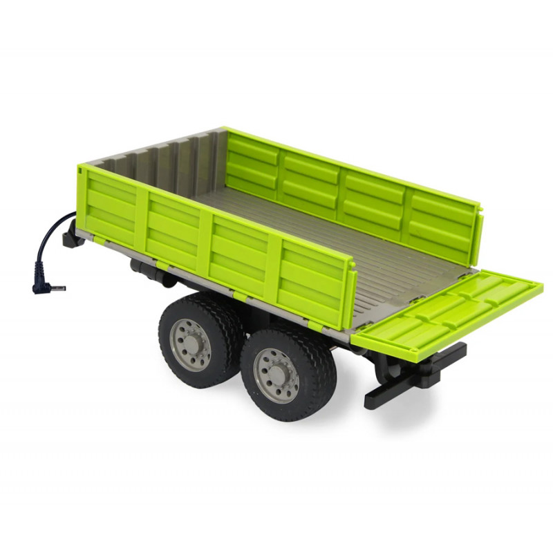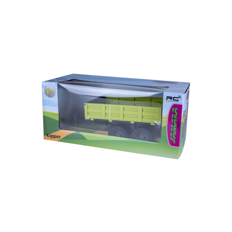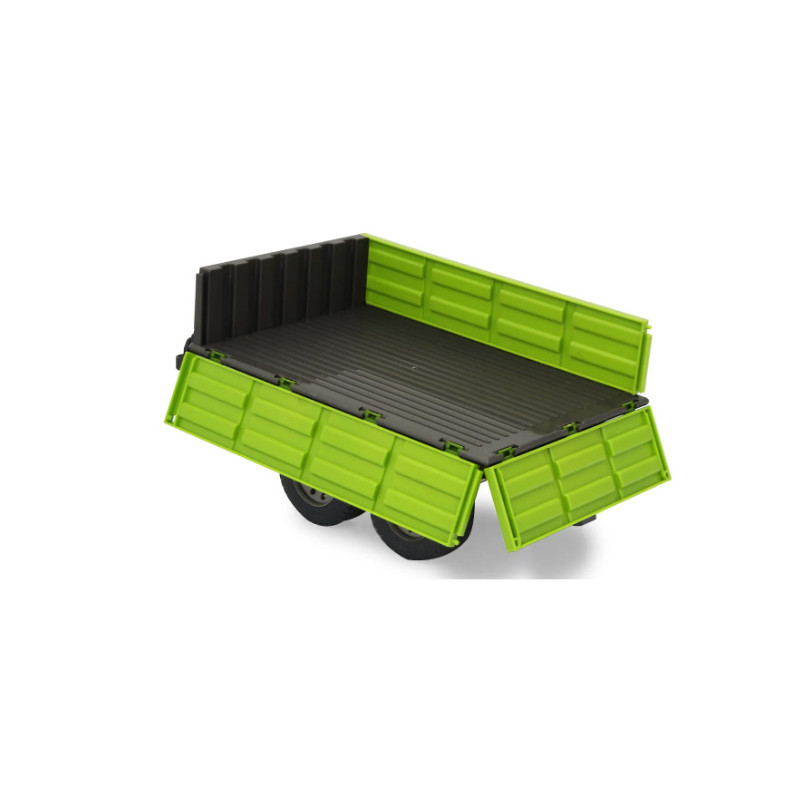 Cette remorque basculante radio-commandée de couleur "vert clair" est compatible avec les tracteurs radio-commandés à l'échelle 1/16 du fabricant JAMARA, la benne se lève et s'abaisse à partir de la télécommande du tracteur.