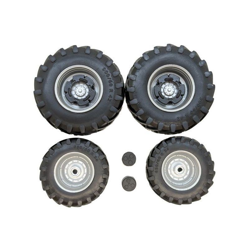 Set de 2 roues avant et 2 roues arrières Trelleborg 900-600 R42 avec jantes grises à l'échelle 1/32 pour modification ou création artisanale d'un tracteur miniature.